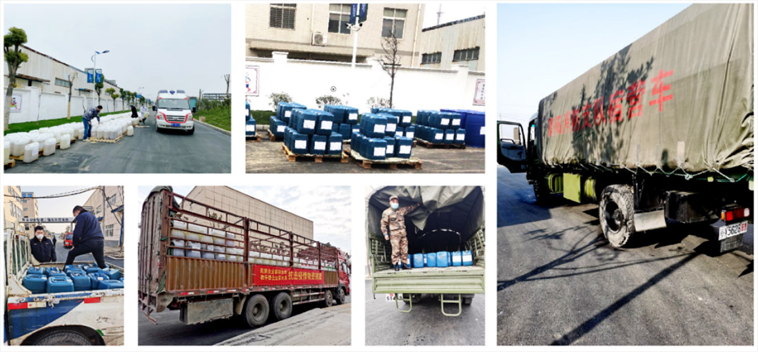 2020年年初新冠疫情全面爆發(fā),湖北又是全國的疫情中心。國難當頭,董事長帶領金達成部分領導主動請纓,勇?lián)厝?,面臨種種困難,發(fā)揮黨員沖鋒在前、迎難而上的作風,生產(chǎn)84消毒液原液三百余噸,市值達四百萬,全部無償捐贈給疫情最需要的地方。